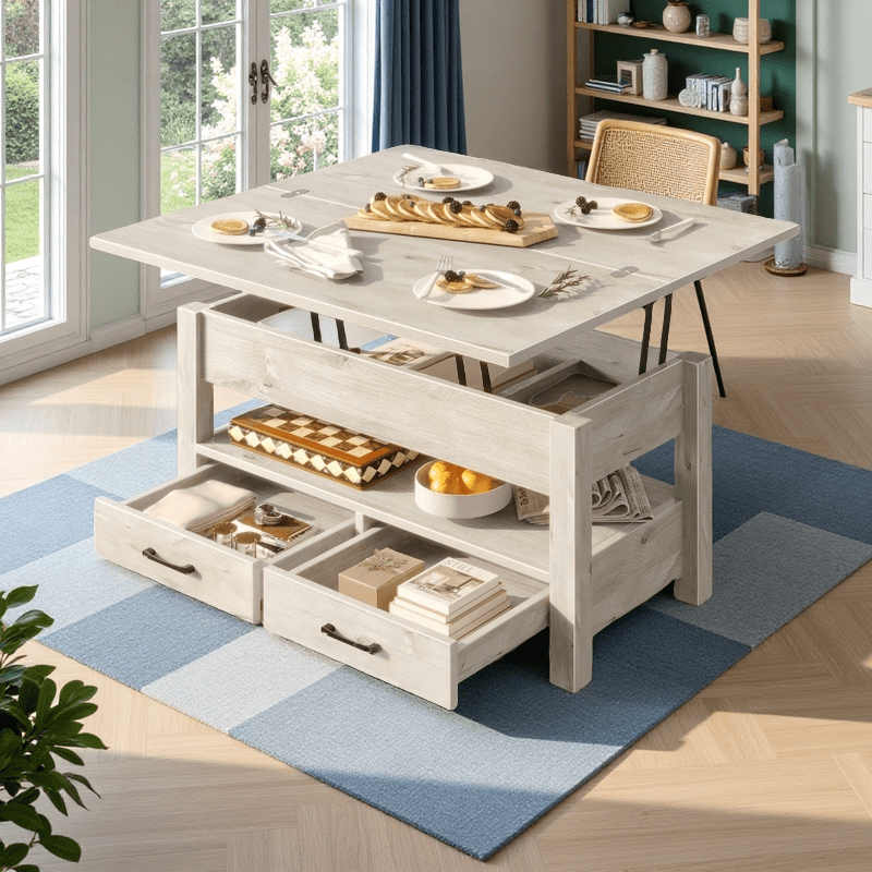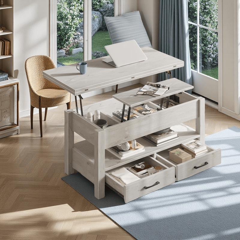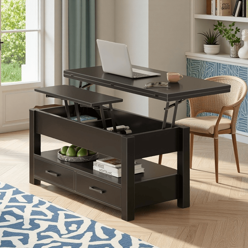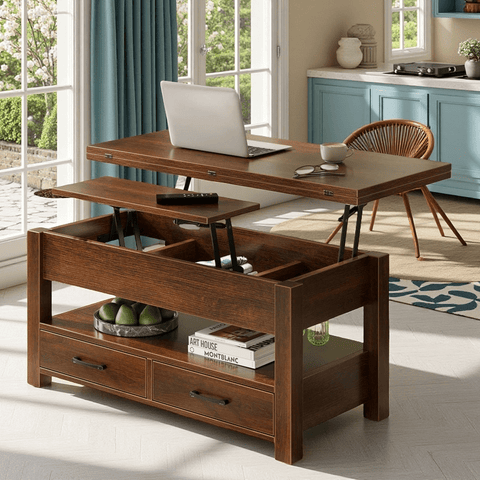· Split Lift-top Design 3 Ways to Use The split table top can be lifted in different directions to offer two independent-use spaces, allowing you and your family to use the table separately without interruption. The larger table top board can be turned 180 degrees freely for dining. So this coffee table is not only a functional table in the living room or reception room but also a home office desk or dining table.