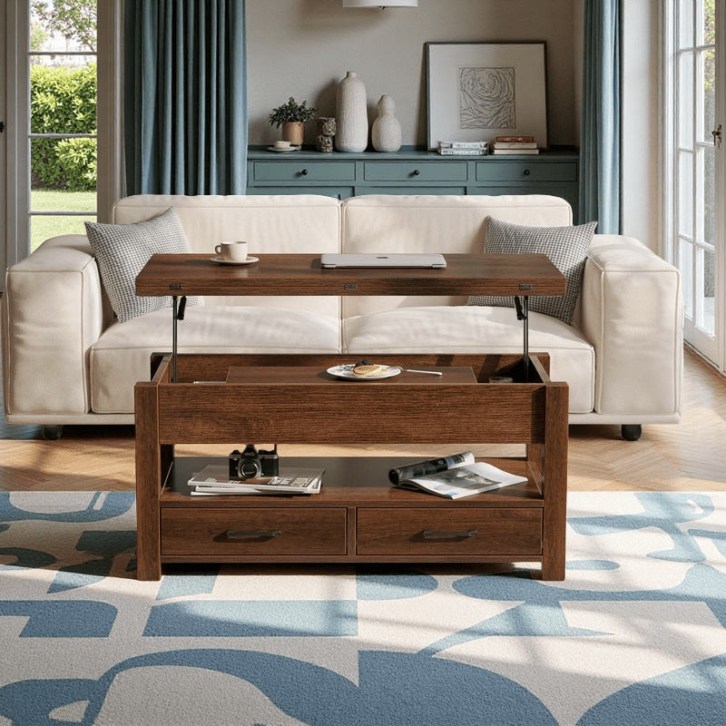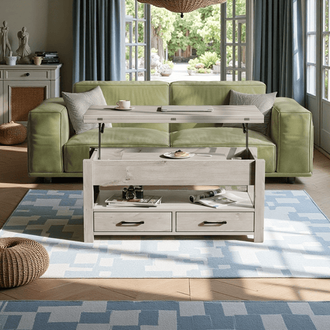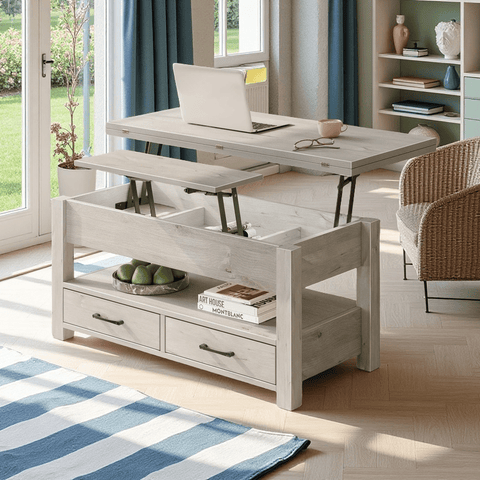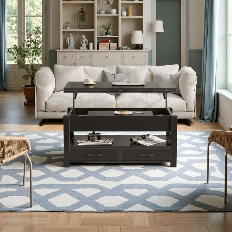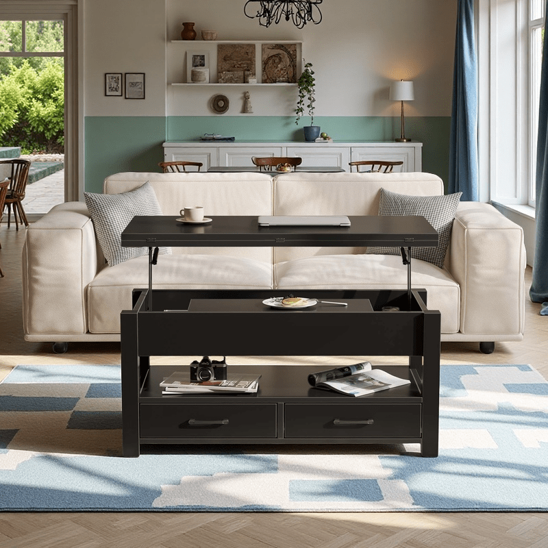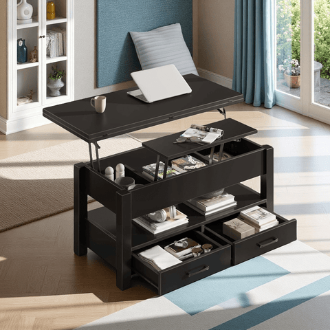 · [Large Storage Spaces] Beneath the handy lift-top surface are 3 hidden storage areas that provide you with the perfect spot to stow away any around-home essentials you typically wouldn't want your guests to see. 1 open shelf provide perfect place for you to display exquisite decorations. 2 sliding drawers expand your available storage space for an uncluttered living room.